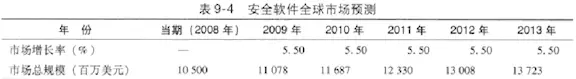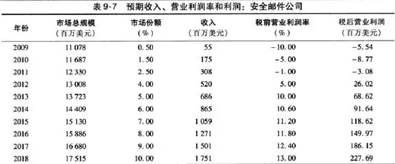 1) 市场总规模。安全邮件公司计划出售反病毒软件。我们采用安全软件(包括反病毒软件)的全球市场总规模的评估值—来自高德纳公司2008年数据。表9-4概述了这个市场规模2008年的评估值和2009- 2012年的预测值。