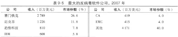 2) 市场份额。为了评估市场份额,我们看看在2008年这个市场上最大的几家反病毒软件公司(就市场份额而言)。表9-5(也来自高德纳公司)列示了最大的几家公司及其市场份额。