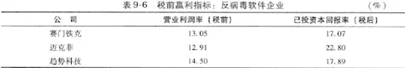 3) 营业利润/利润率。为了评估十年后的预期营业利润率,我们仔细了解了在2007年几家主要经营反病毒业务的最大上市公司的税前营业利润率和已投资本的税后回报率(见表9-6)。