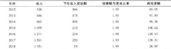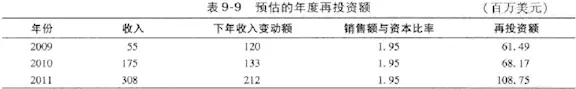 注意:第一年再投资额的计算是基于从第一年到第二年的收入变动额、并采用了1. 95的销售额与资本比率: