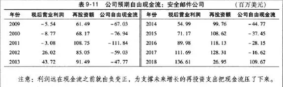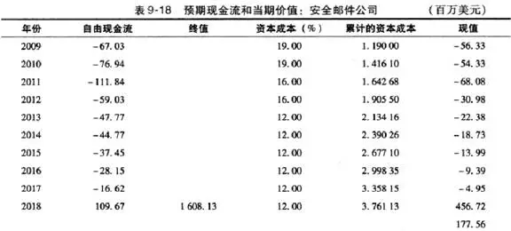 5) 再投资。我们假设随着安全邮件公司在这个不断增长的市场上拓展其市场份额,其收入在第十年增加到了17. 5亿美元。为了评估安全邮件公司需要再投资多少资金,才能创造出这笔收入。我们采用了这个行业里的收入与已投资本比率1. 95(基于这项业务上市公司的收入和股权面值比) 。我们还采用了再投资和增长之间一年的滞后期。用来评估每年所需的再投资额。表9-9概述了我们的评估值。