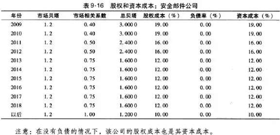 由于该公司的所有者不愿意使用负债,且自身的杠杆率很低(负债/股权比率=6% ),所以,我们假设该公司的资本一直都是股本。用4%的无风险利率和5%的市场风险溢价,我们就可以得到安全邮件公司的年度股权成本(见表9-16)。