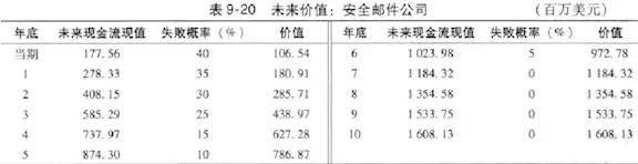 每新增一年的生存机会,该公司的价值会有较大的变化。失败的概率会随着时间的推移而逐渐消失,股权成本也会降低,正向现金流更加临近。表9-20评估了安全邮件公司一直到其首次公开发行的第十年的价值。