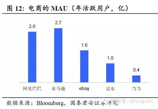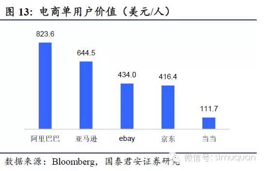 我们对比了国内外知名的电商企业,平均每用户价值为486美元(按市值计算)。由于阿里巴巴的业务中涉及到部分中小企业间的B2B业务,京东的单用户价值可能更好地代表了市场对中国电商的评价。而当当网的单用户价值就要比京东小很多。