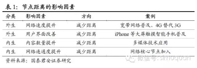 可以看出,网络节点之间的距离,有外生的因素、亦有内生的因素。科技进步和基础设施建设带来的如宽带网络的普及、4G大面积推广、智能手机等智能移动终端的广泛应用带来用户界面易用性提升等因素,可以全面提升整个网络的价值。对于个体互联网企业来说,这些是外生的因素。