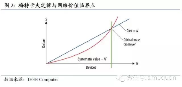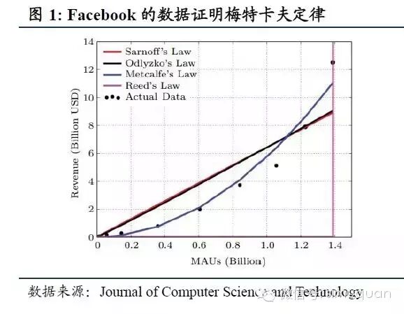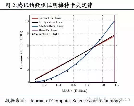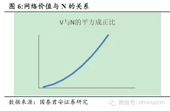 如果一个网络本身只是一个中心联系众多用户,这种网络的价值实际上并不高。而类似像腾讯、Facebook这种节点和节点间有着较多联系的网络价值会高很多。有机会实现梅特卡夫定律所预测的平方级增长。