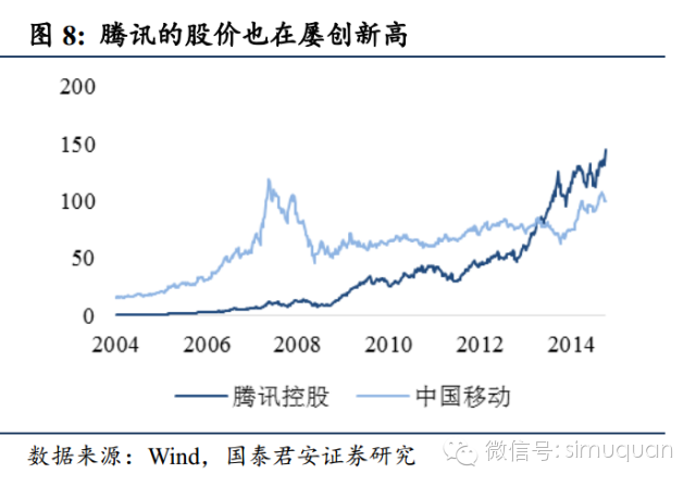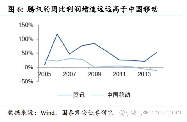 中国移动2014年的收入为5818亿元(人民币,下同)、净利润为1093亿元;而腾讯的收入只有789亿元、净利润为238亿元。中国移动的收入是腾讯的7.4倍,净利润为腾讯的4.6倍。但收入和利润上的巨大差异,在市值上却体现地并不明显。中国移动的市值只是腾讯的1.5倍,相应地,腾讯的市盈率基本是中国移动的三倍。腾讯和中国移动的用户数基本是在一个体量上,但市场对他们的看法也仍有很大不同。