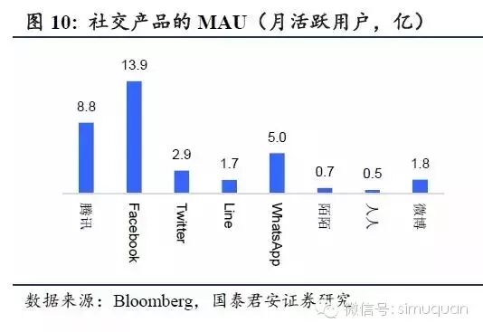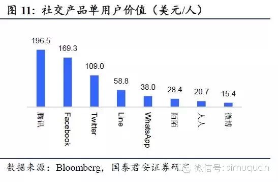 聚焦于中国的社交产品,腾讯一家独大,且体现出了明显的规模效应。但需要提示的是,这里的单用户价值实际上计算了腾讯的游戏等收入,并非仅仅QQ或微信。单纯的社交产品如新浪微博等,由于没有好的变现模式,单用户价值并不高。仅有15.4美元。