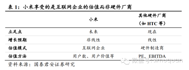 小米向投资者呈现的商业模式是一个美丽的生态系统。小米强调“硬件+软件+服务”三驾马车,MIUI、小米手机、小米路由器、小米盒子等等诸多产品实际上是个一体化的用户生态系统(见国泰君安策略“商业模式系列报告第四篇《软硬一体化,“小”虾”米”玩转大生态》“)。这个系统有一些很好的对标,如苹果、腾讯、阿里巴巴等等。这种生态系统可以牢牢地占据市场中的一席之地,享受稳定增长的盈利能力且不会被轻易地替代。一般的应用级公司差不多能做到十亿美元规模就已经很大了、平台型的公司市值可能达到百亿美元,而真正的大型生态系统级公司往往都可以达到千亿美元级别的市值。各个阶段的投资者(从天使轮到A、B、 C轮..),都会在概率的基础上为这个故事买单。——而他们对硬件厂商只会看盈利。