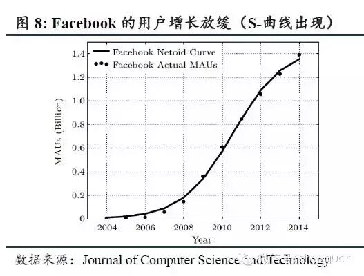 互联网领域的企业增长也依然符合这一定律。在用户数达到一定数量的时候,再想获取新的用户就变得较难。最终呈现出S-型曲线,如下图的Facebook用户数增长已经渐渐放缓。