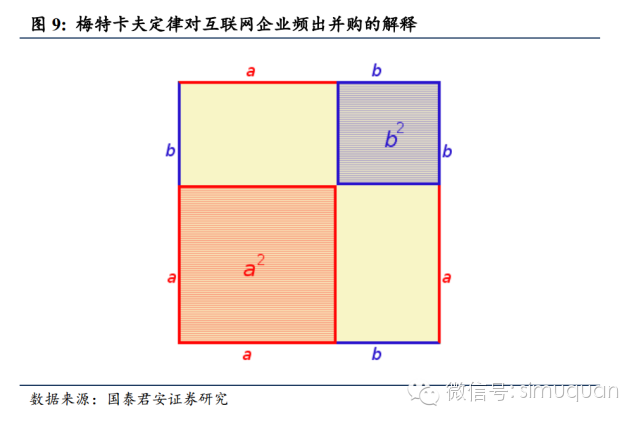 4.互联网是开放的,但并不平等。互联网的一个重要特征就是赢者通吃。梅特卡夫定律告诉我们网络的价值与用户数的平方成正比,这意味着用户数相差不多会导致网络价值相差很多。进一步地,落后者未来获得新用户、新资源的机会都要比领先者要小。梅特卡夫定律加剧了互联网的马太效应。因此,投资者往往会极为重视互联网企业的行业地位,他们会愿意付出高溢价来购买领先者的股权。