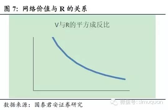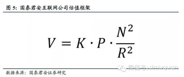5.我们给出了国泰君安互联网公司估值框架:V=K*P*N^2/R^2。V是互联网企业的价值;K是变现因子、P是溢价率系数(取决于企业在行业中的地位)、N是网络的用户数、R是网络节点之间的距离。