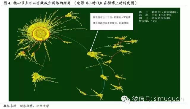 高连通度节点可以很有效地减小网络的“距离”。这实际上牵扯到社会网络分析中的“小世界”现象。我们在本文中不做赘述。在此仅举一个生动的例子:郭敬明电影《小时代》在新浪微博上的转发路径图。我们可以看出从郭敬明发出到该微博获得10万转发量,对“最远”的节点也仅需要花十几次转发即可抵达。但如果没有中间的高连通度节点,则右边的所有人可能都要经过20次甚至30次的转发才能收到这一消息。
