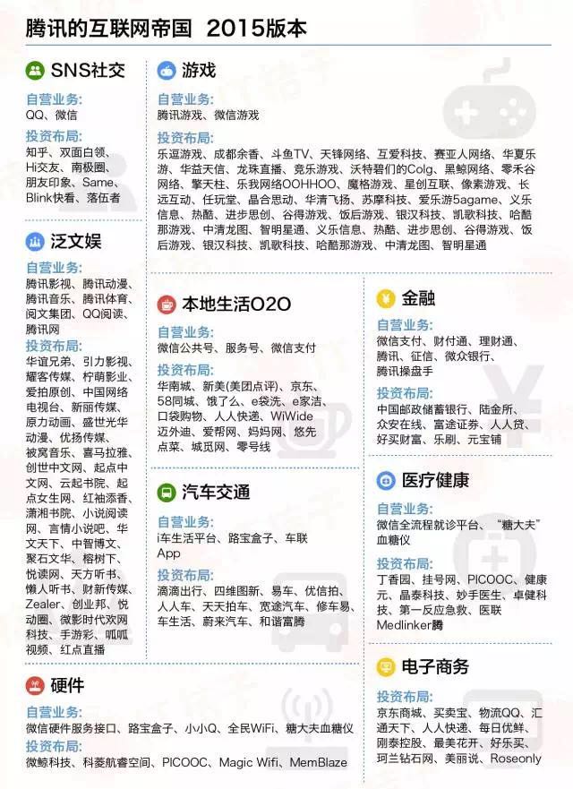 腾讯的业务布局思路,与阿里巴巴有很大不一样,腾讯这几年更多在做减法,尤其是在电商、搜索卖掉之后,腾讯更加聚焦:“连接+内容”。“连接”方面,一方面是连接人与资讯,围绕公众号,在知识产权进行了更多的保护与举措;另一方面是连接人与服务,微信推出了很多的商业应用场景,通过一些与第三方服务商的合作,让微信作为用户的入口、支付的闭环,俨然成为一个O2O分发入口。“内容”(数字内容、泛娱乐产业)方面,腾讯主要围绕游戏、文学、动漫、影视四个方面进行,形成了如下的文娱帝国。伴随着微信支付的快速发展,腾讯的互联网金融业务在经过多年之后、终于找到关键点,虽然还没法达到阿里金融业务那样的布局,但发展速度很快,支付领域给支付宝很大的压力,理财、银行、征信业务也在拓展中,再加上腾讯战略投资的京东金融发展速度更是迅猛,组成的金融联盟还是比较强大的。本地生活O2O这几年是BAT三家激烈竞争的热地,与阿里、百度自己冲锋陷阵不同,腾讯的策略是“连接”与“开放”——依托微信、QQ,通过资源或资本注入的方式,让创业公司冲在前线、自己在后面“遥控”。腾讯2015年对卖掉的电商业务进行收尾之后,在这个领域采用了全新的策略:围绕支付核心,一端投资物流、货运等基础环节,另一端则继续投资垂直电商品类。医疗健康领域,也开始上升到新的战略高度,腾讯在这个领域明显加大了投入。一端走政府路线,另外一端腾讯还加强了和龙头企业的合作。汽车交通领域,腾讯也进行了很大的布局,主要采取投资策略。遵循“连接”核心,一方面搭台,建设汽车电商“支付-营销(核销)-社交”三方闭环,另一方面继腾讯路宝外,继续延伸车联网战略。教育领域,在和新东方设立合资公司后,腾讯自己围绕教育的布局不太那么多了。旅游领域,携程去哪儿百度资本大变动之后,腾讯重金投资的同程旅行、还有此前很早就投资的艺龙如何跃升一个台阶,是接下来的方向。企业服务/技术领域,腾讯云相比阿里、百度慢了几个节拍,在2015年终于正式提出云业务战略规划,预计在2016年会是发力的一年。