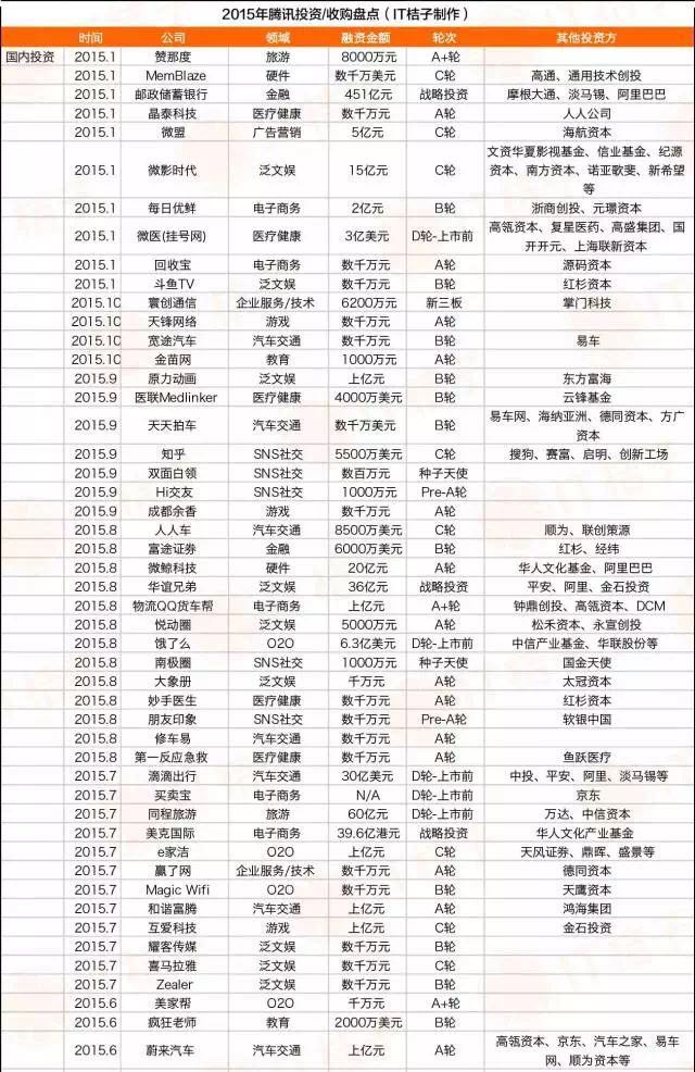腾讯在2015年继续延伸“企鹅帝国”的边界,一方面围绕社交SNS、游戏、泛文娱、O2O等加强优势业务;另一方面也在金融、电商、医疗健康等领域继续加大投资,国际化和海外策略上,腾讯的步子比阿里迈得更大,尤其是在游戏出海等方面。这一年,腾讯估价从年初的112.5港元上涨到年末的152.5港元,上涨幅度35.6%,市值达到14340万亿港元(约合1841亿美元),全球第6大互联网公司;这一年,腾讯收入从2014年底的789.32亿元增长到2015年度的724.22亿元(未包括2015Q4数据,预估也接近1000亿元),同比增速超过27%,增速继续下滑;这一年,腾讯投入55亿美元投资了超过95家公司、斥资了3亿美元收购了3家公司、花费了7亿美元投资了25家海外公司;这一年,腾讯围绕“连接+内容”战略,在社交、游戏、文娱的帝国不断扩大疆域,O2O、医疗、电商等正在加强。