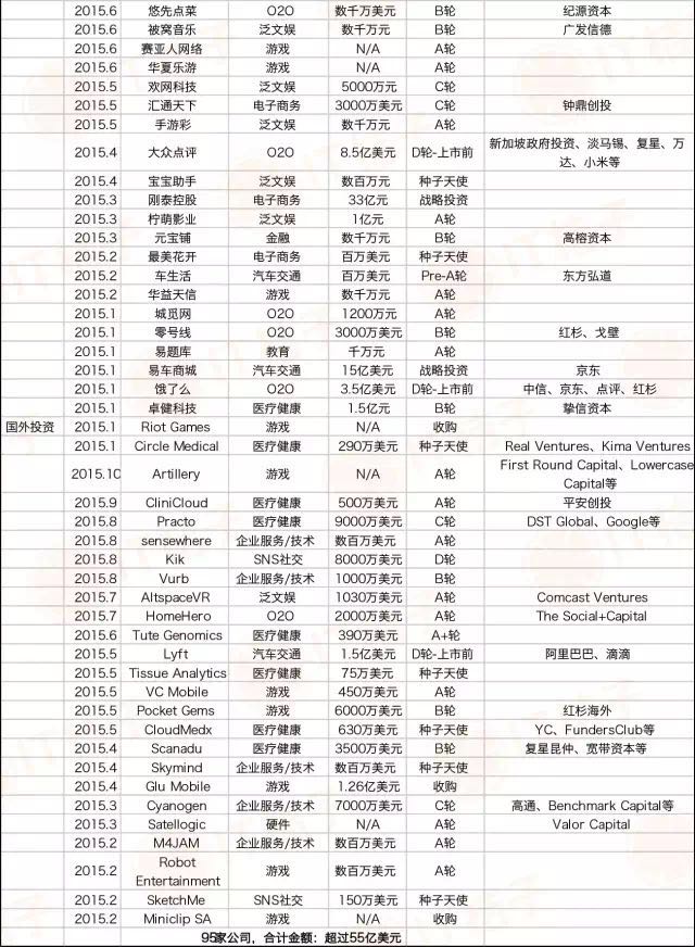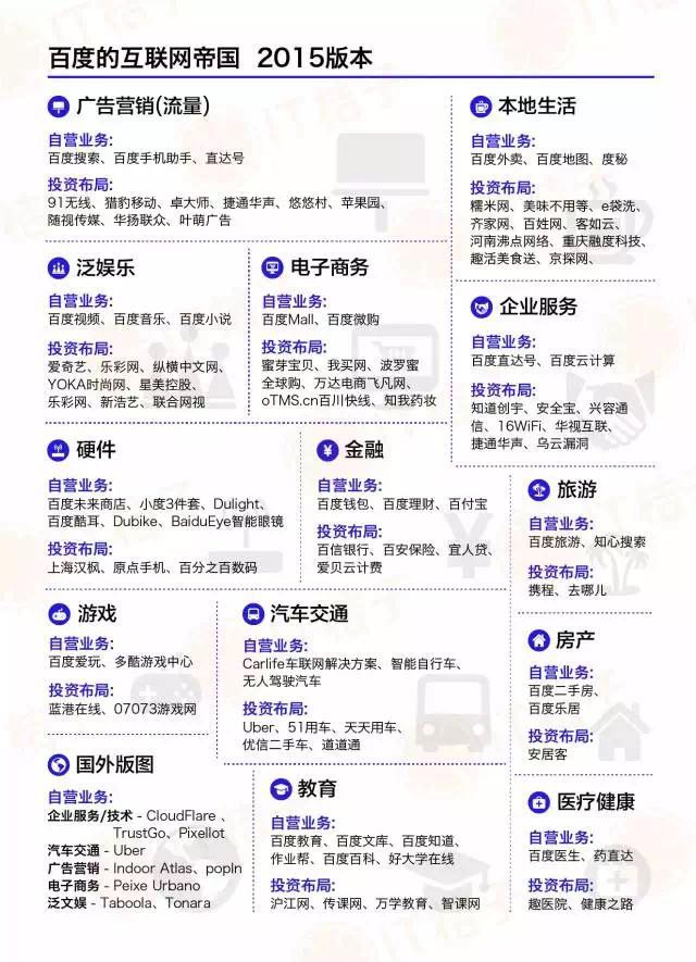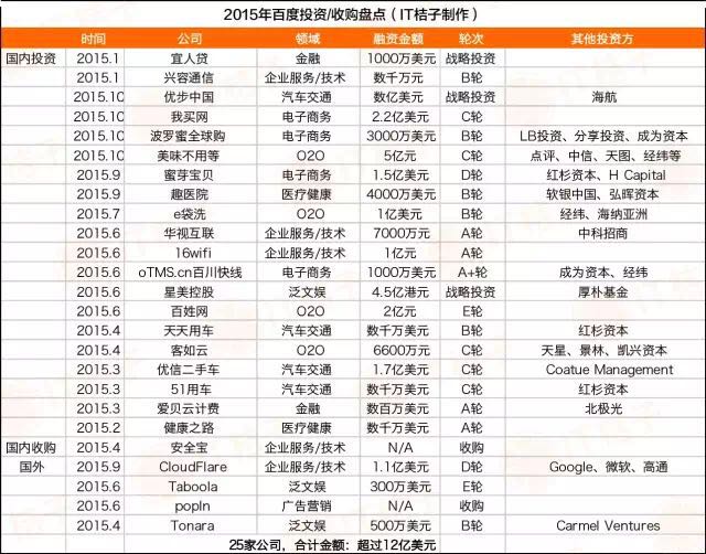 相比阿里巴巴和腾讯如日中天的气势,百度似乎总没有摆对姿势,时不时被大家质疑战略和新业务没有脱颖而出,事实上在2015年百度的战略正逐步清晰,一方面是聚焦业务,自己坚持做的重金投入、没有做好的引入重磅合作伙伴、不准备做的则坚决拆出去;另一方面则是启动“航母计划”,面向外部投资者开放更多的百度资产。这一年,百度股价从年初的227.97美元下跌到年末的189.04美元,下跌幅度达到17%,市值达到653亿美元(约合1841亿美元),全球第7大互联网公司;这一年,百度收入从2014年底的490.52亿元增长到2015年度的478.83亿元(未包括2015Q4数据,预估年营收超过670亿元),同比增速超过37%;这一年,百度投入12亿美元投资了超过24家公司、花费了5000万美元投资了4家海外公司;这一年,百度围绕“航母计划”,一方面将教育、音乐、外卖等资产开放出去吸引第三方投资者,另一方面自己不断加强O2O、医疗、汽车交通及技术方面的投入。 与阿里的核心是“交易”、腾讯的核心是“人际关系”不一样,百度是技术出身,很长时间里都践行着“连接人与信息”的策略,目前战略也开始调整为“连接人与服务”,围绕服务相关的O2O成为百度这几年最为重要的事情。过去3年时间里,O2O都是百度最重要的投入与布局,到了2015年终于在金钱+时间付出中,有了明显收获。无论是糯米网、百度外卖等服务载体,还是百度地图、直达号、度秘等流量入口,百度2015年继续前进。百度现金流很充裕,在Q2宣布未来三年内对旗下的糯米网投入200亿人民币,力推O2O业务发展;Q3百度外卖拆分,独立融资2.5亿美元,吸引外部资本的力量试图在外卖市场与美团、饿了么、口碑网一争高下;9月百度世界大会上,百度发布的智能私人秘书工具“度秘”,也希望打造O2O服务的智能入口。伴随着百度在O2O的投入,百度钱包也加大了推广力度。围绕O2O,百度投资上也大手笔跟上:随着58赶集的合并,百度快速投资了分类信息的另外一家公司“百姓网”;百度外卖所在的餐饮领域,百度也先后投资了客如云、美味不用等,从B端商家的角度获取更多资源;投资e袋洗,这是一个可以把用户下沉到用户家庭的入口。O2O基础设施尤其是WiFi领域,是百度特别发力投资的,投资了兴容通信、16WiFi、华视互联三家公司。对于垂直产业的参与,百度坚持“中间页”战略,这几年下来,有几个领域是百度特别注重与加大投入。汽车交通产业是这一波创业浪潮中最火热的领域,首先是在交通出行领域,一方面与百度地图有天然关系,另一方面则是线下重要生活入口。在腾讯阿里与滴滴快的的关系之外,百度加大了与Uber的联系,在人事和产品两方面与Uber合作。此外百度还围绕汽车共享用车及拼车服务,先后投资了天天用车、51用车。围绕车联网、汽车科技,注重技术的百度将其作为自己的业务进行拓展,例如、Carlife车联网解决方案等。二手车领域,百度也大手笔进入,领投了优信二手车1.7亿美元的C轮融资。医疗是百度2015年非常注重的方向,Q1百度成立了移动医疗事业部,推出百度医生APP,而后与公立医院合作;Q1百度发布了药品O2O服务“药直达”,通过和药店合作;Q3百度领投了“趣医院”B轮融资,延展在医院和医生端的资源;Q4百度外卖全面上线了药品快送O2O板块,围绕消费者端进行布局。百度金融到现在都还没有“主心骨”业务,在大力推广“百度钱包”的同时,百度也开始着手新的业务探索,包括“百信银行”“百安保险”,推出混合基金、与银行合作开展授信服务等。目前看百度还没有拥有金融船票,事实上百度的中间页战略,为其在旅游、教育、医疗、二手车等消费领域都预留了运作空间,只是百度还在自己发力、与其他公司合作之间徘徊,导致战略不定。比如大家期待已久的教育贷、旅游分期、汽车金融、医疗支付等都还没有正式推出。教育是百度在2014年最发力的领域,到了2015年则是消化吸收的一年。包括分拆“作业帮”,成立百度教育事业部、百度文库事业部,推出“光合计划”,建立信用体系等。对于百度而言,旅游领域是其大有收获的领域,在2015年更是影响了整个在线旅游格局,携程、去哪儿、百度之间的合并、换股,一下子让百度持有携程25%的股份、成为第一大股东和既得利益者。在其它领域,这里只挑选部分做简要介绍,详情参见年度盘点报告。电商领域,百度上线“百度MALL”,与O2O业务进行协同,投资5家电商公司等;硬件领域,百度是先行者,同时进行技术上的突破,扶植智能硬件团队等;企业服务领域,除了服务中小商家外百度并没有太大的动作。