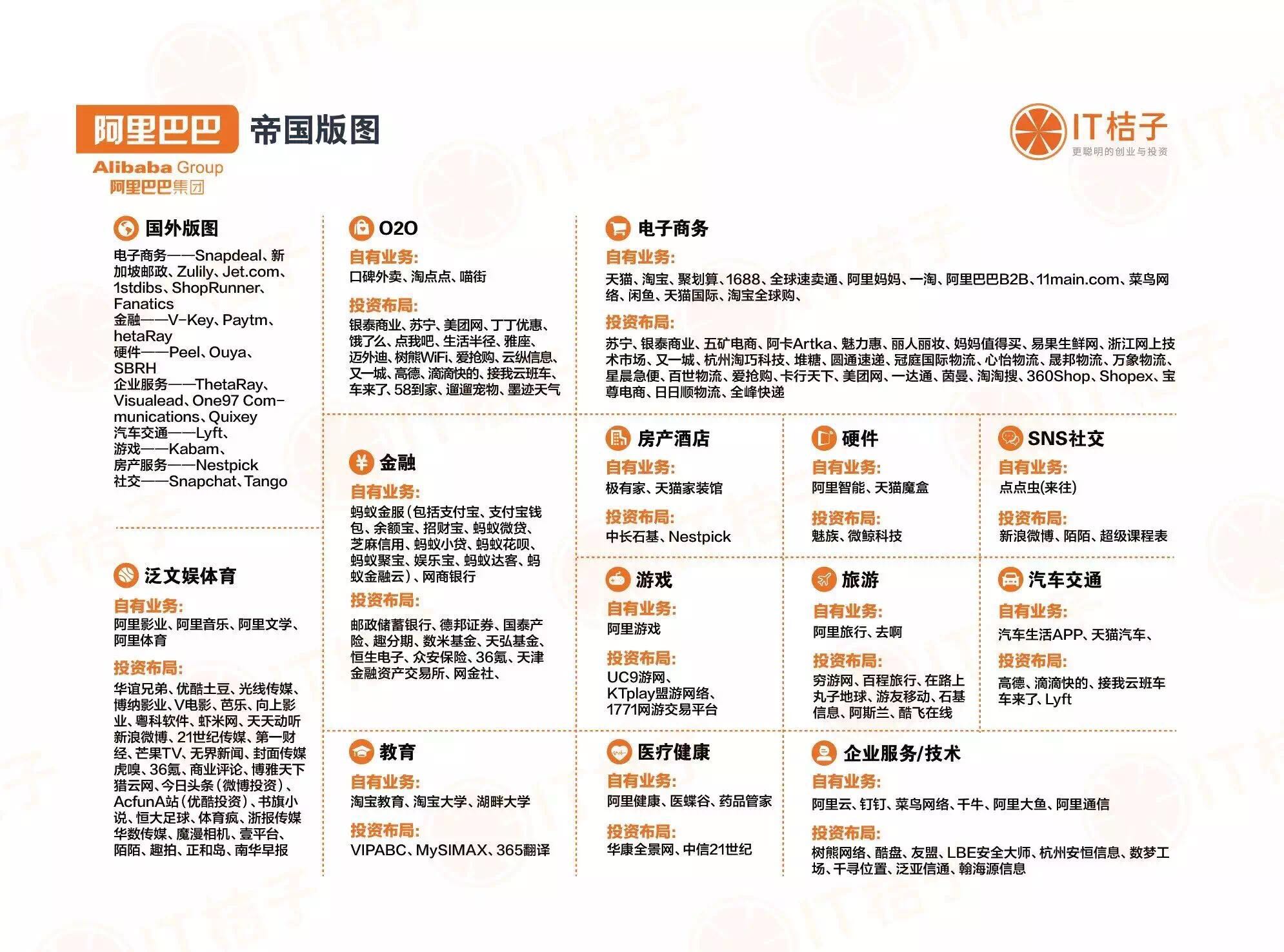 阿里巴巴的使命是“让天下没有难做的生意”,紧紧围绕交易核心,构筑全新的商业生态圈,在这个版图中,电子商务、金融是绝对领先业务;本地生活O2O、文娱媒体、医疗健康、企业服务(云计算)是相对领先业务;旅游、硬件、游戏、教育、汽车、房产是持续投入与突破业务。本篇简要介绍阿里巴巴的四根顶梁柱:电子商务、金融、本地生活O2O、泛文娱。电子商务领域,阿里巴巴2015年主要围绕全球化、农村电商、物流体系进行布局,年底重启发力B2B。全球化方面,进口业务主打天猫国际、淘宝全球购,出口业务主打1688.com,也在海外本地化上进行了一系列动作;农村电商方面,阿里巴巴主打“农村淘宝计划”;物流方面,国内通过菜鸟网络加强基础设施建设,跨境物流上开展国际航线包机业务;B2B电商方面阿里与五矿共建钢铁B2B电商,同时推出“城市合伙人”计划。至今阿里形成了如下图的电商帝国。金融是阿里巴巴集团的另外一大优势业务,在2014年10月组建蚂蚁金服统筹整个金融业务之后,2015年进行了全面扩张,业务涉足支付、征信、借贷、理财、保险、银行、众筹、证券等多个领域。但同时,蚂蚁金服的多条业务线在2015年都面临激烈竞争与挑战。此外蚂蚁金服在2015年进行了两轮很大的战略融资,估值超过3000亿人民币,形成了如下图的金融帝国。本地生活O2O是阿里集团的第三根顶梁柱,也是在其电商、金融业务遇到瓶颈的时候,围绕各种场景化消费进行破局的关键点。2015年阿里巴巴最大的动作就在于“集中”——通过重塑口碑网品牌的方式,将阿里巴巴自营的O2O业务进行集中,至今形成了如下图的O2O帝国。阿里巴巴通过自建经营+对外投资的方式,搭建了一个庞大的“文娱帝国版图”。2015年,阿里巴巴对各条业务线进行重组,并赋以“阿里+XX”的名义,组建的事业群包括:阿里影业、阿里音乐、阿里文学、阿里游戏、阿里体育等。经过2015年的重组后,形成了如下图的文娱帝国。在其它领域,云计算与企业服务领域,阿里巴巴是BAT三家中动作最早也是最大的公司,现在看也是受益者,2015年大力发展承担着互联网IT基础设施“水煤电”使命的阿里云,通过开放平台的方式向企业用户提供合作方服务;医疗健康领域,2015年阿里围绕药品零售O2O、医疗云服务、药监码、健康保险四个方面进行。阿里在旅游、房产、汽车交通、房产、教育、硬件等多个领域都有布局。