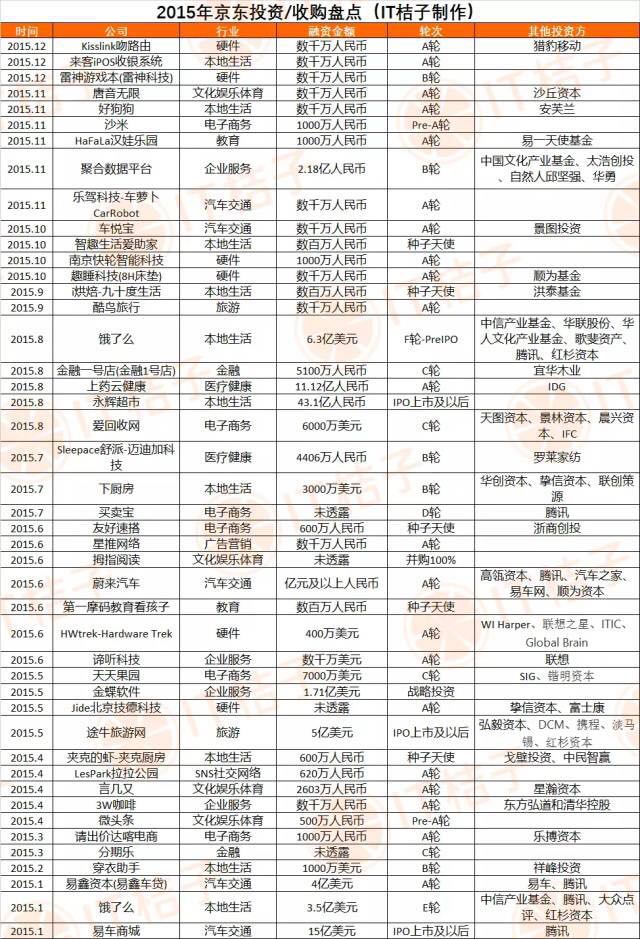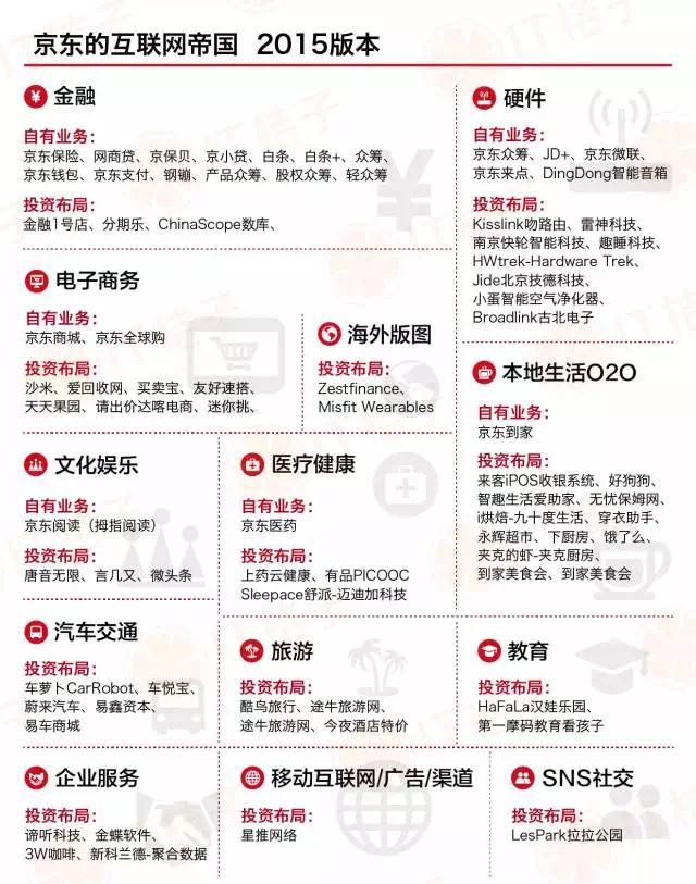 京东集团的核心业务领域包括电子商务、金融、智能硬件、本地生活,分别对应京东商城、京东金融、京东智能、京东到家,以及接下来要大力发展的企业服务领域。电子商务业务是京东集团最主要的业务,京东2015前三财季净营收1266亿元,累计GMV达到3173亿元,加上配套的仓储物流,以及近年来发力发展的跨境电商、农村电商、垂直品类电商等,京东在2015年开始有意识进行了深度布局。2013年10月,京东金融脱离京东集团开始独立运营,自此之后京东就在打造一个金融帝国。2015年9月,“一站式金融生活移动平台”上线,预示着移动端金融入口是京东必争之地。2016年1月,京东金融获得红杉资本、嘉实投资和中国太平10亿美金投资,投后估值约为460亿人民币,并预计将在2017年上市,整体看,其成长速度惊人。目前京东金融拥有第三方支付、基金销售、商业保理、小额贷款、支付许可、跨境电商等六大金融牌照,形成了支付、供应链金融、消费金融、众筹、财富管理、保险、证券七大业务板块的架构。本地生活O2O也是京东集团非常注重的领域,通过“京东到家”为主要载体提供服务,当然这个领域对于京东而言在初期阶段,不过京东已经在组织架构上做好了准备。智能硬件方面,京东主要以京东智能为基础,来打造智能硬件生态链,大力发展智能产品众筹平台,加大京东智能云平台的建设,孵化、投资智能硬件企业。同时为B端、C端用户服务,旗下JD+连接智能领域创业伙伴,京东微联链接人与设备、设备与设备,打通智能硬件产品之间的隔阂,配合应用场景布局智能家居、医疗硬件等。文娱内容领域,京东于2015年6月收购了社交阅读应用“拇指阅读”,并同步上线了新版京东阅读APP,试图加强其阅读社区属性。汽车交通领域,京东主要还是以销售导向为主,重在加码商城低频消费品类的丰富度。2015年1月,京东联合腾讯以现金和资源形式投资了易车,2015年3月京东又投资了源于易车的易鑫资本,4月由易车网运营的“京东整车频道”全新上线。企业服务领域,京东于2015年5月1.71亿美金战略投资金蝶软件,占股10%。旅游方面,5月途牛宣布获得总计5亿美元的投资,其中京东将投资2.5亿美元现金及1亿美元资源及运营支持。四个月之后,京东与途牛共同推出休闲旅游频道。