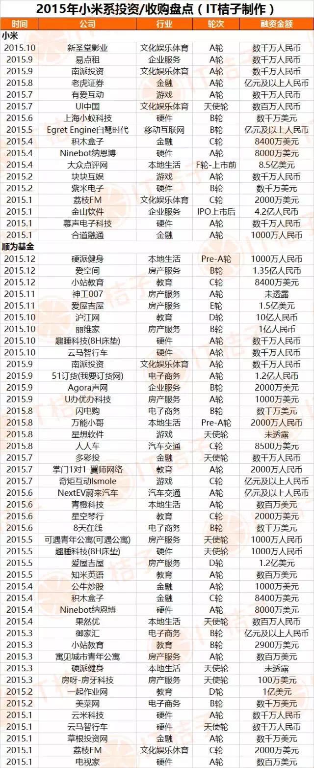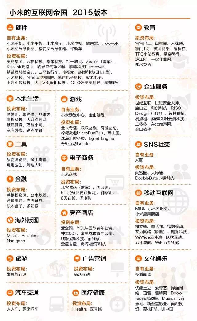 小米成立的前3年,专注于手机业务,而后开始延伸到平板、电视等产品线,在2014年开始打造小米生态链、涉足更多的产品,到了2015年,小米更是通过自营+投资布局的方式继续扩大生态链。在这些链条中,硬件、文娱是小米的主线。作为智能硬件领域发展最快速的科技公司,小米在2015年分别在自有产品研发、海外市场拓展、生态成员成绩单、智能出行和通讯领域都有所收获。小米在硬件有了足够多的用户基数之后,立即着手的就是文娱上面的内容,为此小米组建“小米互娱”部门,围绕泛文娱也进行了很大的拓展。教育方面,在线教育显然是内容建设中最具前景的发力点,小米的动作包括投资儿童教育产品宝宝巴士,与沪江网合作打造大学生移动直播课堂等。金融方面,小米在2015年正式进军金融,推出小米金融、小米钱包、小米活期宝、小米小贷等,围绕“用户——电商——支付——金融”逻辑打造品牌生态闭环。对外投资上,小米系投资了草根投资网、老虎证券、多彩投、合道融通等公司。房产方面,小米投资了互联网装修“爱空间”、房产O2O营销平台“房呀”、长租品牌公寓“寓见城市青年公寓”,为小米智能家居生态的落地提供实体运作可能。