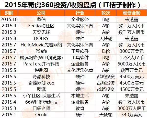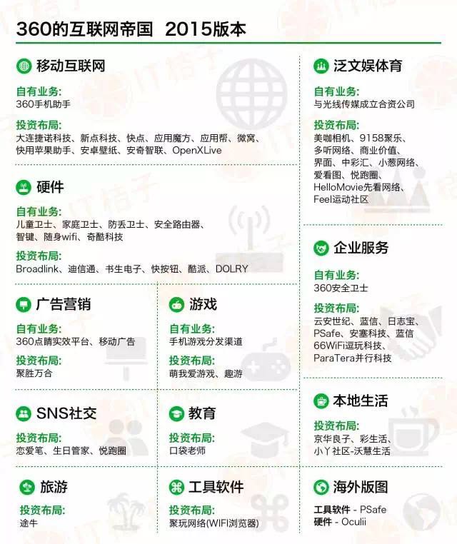 过去两年多,360一直在找寻新的业务增长点,探索的方向包括智能硬件、文化娱乐、企业服务、教育、金融等领域。鉴于很多行业里360都还是新军,在做法上还是相当谨慎的:即与该行业的领军企业进行战略合作,打算强强联手以创造更大的价值。除开业务外,360在2015年最大的动作当属私有化与回归A股,几乎伴随着全年,到目前为止仍未完全完成,不过3600亿元市值的预期已经被A股很多人所期待甚至接受。硬件是奇虎360最花力气探索的领域,毕竟可以将入口、渠道、内容等多层面的服务都融合到一起。旗下自有产品有儿童卫士、家庭卫士、防丢卫士、安全路由器、智键、随身wifi等,还有合资公司奇酷科技;近几年还先后投资了Broadlink、迪信通、书生电子、快按钮、酷派、DOLRY。2015年360开始加重企业安全服务。组建了专门的企业安全集团,发布用大数据做安全漏洞的预测与回溯的“360天眼”产品,转战偏蓝海的B 端(企业、单位等)市场。除了自身业务之外,360 在2015年还投资了三家企业服务公司:WiFi领域的“聚玩”、大数据领域的ParaTera并行科技、企业移动信息化建设的“蓝信”,涉足企业移动信息化。除开游戏外,360也在其他文娱领域探索,影视、视频领域,年初360与东方明珠技签署战略合作协议。年中360与光线传媒合资的先看网络视频网站正式上线,只是到了11月的时候360就退出该公司。体育也是360特别关注的领域,不过是投资为主,包括悦跑圈、Feel运动社区等。金融领域,360在2015年7月正式组建360金融,并推出其互联网金融品牌“你财富”,8月份360联合大成基金推出“中证360互联网+大数据100指数”。支付领域拥有360安全支付、360钱包等。同时于年底推出非公开股权融资平台360淘金。教育领域,360与学大教育成立合资公司“阳光兔科技”,研发基于移动端的K12个性化学习产品, 5月份推出拍照搜题和老师答疑应用“口袋老师”。