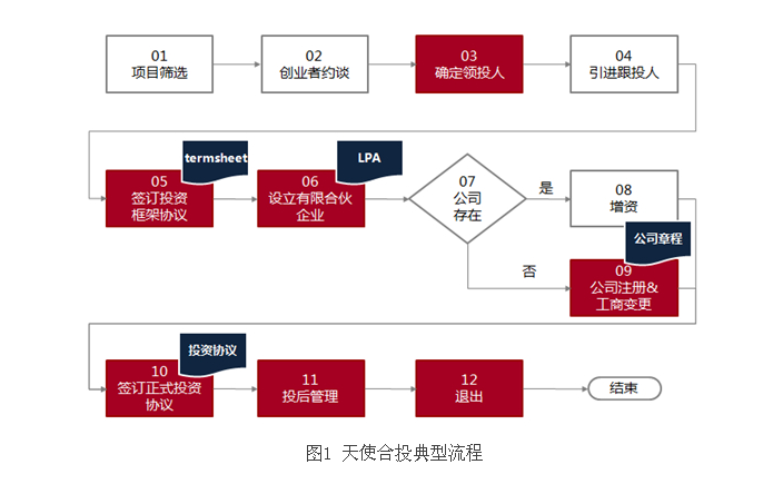 1.项目筛选—> 2.创业者约谈—> 3.确定领投人—> 4.引进跟投人—> 5.签订投资框架协议(TermSheet)—> 6. 设立有限合伙企业—> 7.注册公司—> 8.工商变更/增资—> 9. 签订正式投资协议—> 10. 投后管理—> 11. 退出