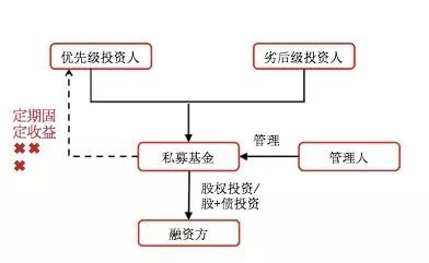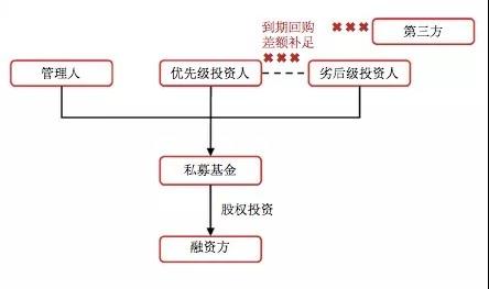第二种模式依旧存在优先级投资人和劣后级投资人,优先级投资人依旧享受固定期限下固定收益,该收益可以有两种方式兑付,一种是私募基金通过寻找第三方流动性支持,定期给予优先级投资人固定收益;另一种是把劣后级投资人的钱定期垫付给优先级投资人固定收益。