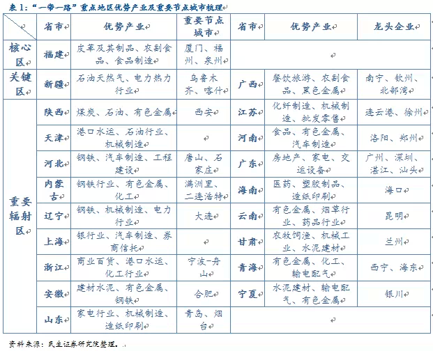 产业协同加速产能去化。“一带一路”涉及内地、沿边、沿海多个区域,经济发展水平差异较大,这为产业协同、产能去化提供了条件。一是,“一带一路”大部分省区属于工业输出、服务业输入,而仅有沿海较发达的上海、天津、广东、海南等属于服务业输出省,第三产业区位商大于1。二是,落后地区“后发优势”明显,各行业发展较快的地区都主要集中在中西部地区。而东部除了通信设备计算机及其他电子设备制造、汽车制造等专业化程度要求较高的行业以外,增速基本上都低于全国平均水平,增长效应上并不占有优势。三是,产业转移升级的速度可能要比预想的快。传统制造业普遍转移,如纺织服装、化工、电气机械(家电)等从广东、山东、浙江、上海、北京等东部地区向湖南、湖北、河南、安徽等中部地区转移。此外,新兴产业亦开始出现转移迹象,四川、重庆、河南、安徽等在承接通信设备计算机及其他电子设备制造业等方面明显快其他中西部省份,而输出省份主要集中在北上广三地;汽车制造也转移亦在提速,但速度慢于通信设备计算机;医药制造的区域转移特征并不显著。