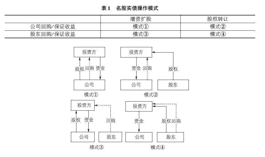 4.交易模式综述。上述3项要素中,投资方取得股权存在两种方式;而保证固定收益和股权回购的义务主体同样存在公司与股东的区别,因此,可能存在的交易模式如表1所示。