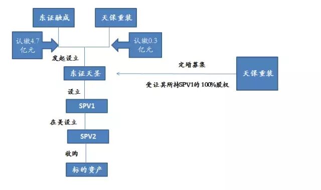 最近的案例是上市公司天保重装的海外收购案例。天保重装于2015年5月1日发布定增预案,拟以26.58元每股的发行价,向实际控制人邓亲华以及长城国融、光大资本、天风证券、东海瑞京-瑞龙11号等发行不超过3762.23万股,募资10亿元,其中4.7亿元用于收购美国环保设备制造商圣骑士公司80%股权及圣骑士房地产公司100%股权,剩余资金用于偿还银行贷款和融资租赁款以及补充流动资金。本次交易,天保重装的本次海外收购将采取两步走的方式:第一步,由上市公司与东证融成共同发起设立东证天圣股权投资基金合伙企业(有限合伙)(简称“东证天圣”),东证天圣还设立了圣骑士环保科技有限公司(称“SPV1”),SPV1于2015年4月2日在美国独资设立CentrisysCapital, Inc(简称“SPV2”),先由SPV2收购圣骑士公司80%股权及圣骑士房地产公司100%股权;第二步,由天保重装通过此次定增募集资金从东证天圣处受让SPV1的100%股份,从而实现对美国目标资产的收购。美国圣骑士公司的产品和服务应用于市政、石油石化、矿山、电力等领域的污水污泥处理。圣骑士公司已签订在执行的产品制造订单达4000万美元。此外,对圣骑士房地产公司的收购,则主要是由于圣骑士公司目前生产经营所需的土地、厂房产权归属圣骑士房地产公司所有,收购可保证资产的完整性和独立性。目前,圣骑士房地产公司的股权结构与圣骑士公司一致,均为德籍自然人Michael Kopper和瑞士企业ABG Holding AG各占50%。天保重装采取“商+投”联动的模式。作为本次海外并购的“桥梁”,东证天圣由东证融成作为普通合伙人认缴4.7亿元,天保重装作为有限合伙人认缴3000万元共同设立。东证融成股东为东证融通投资管理有限公司,即东北证券旗下公司。东北证券的参与,使得海外并购的成功率有所提升。该案例具体操作如下图所示: