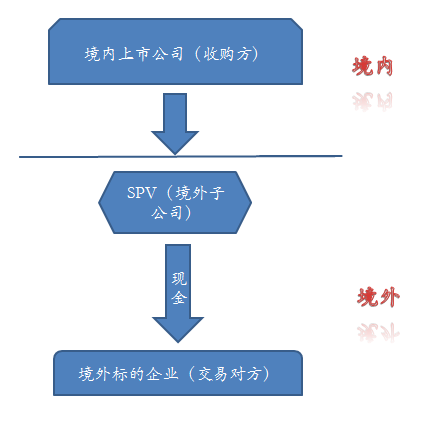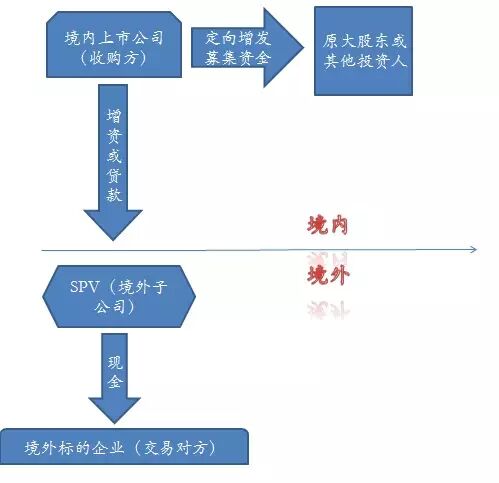 该方案的基本思路是:由上市公司定向增发募集资金,再通过设立境外子公司(SPV)以全现金方式收购境外标的资产。并购所需的资金来自定向增发募集。具体操作如下图所示: