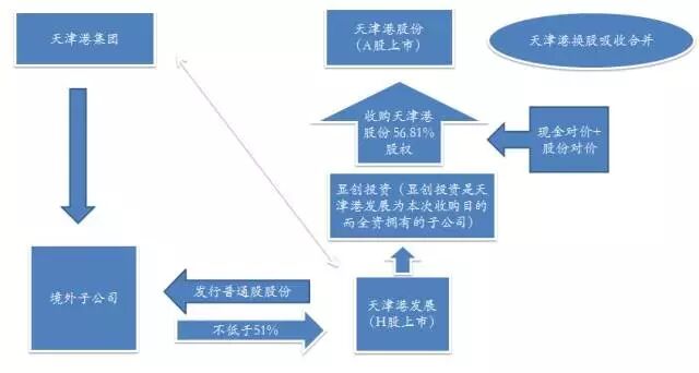 天津港(集团)股份有限公司(简称“天津港集团”)是天津港股份有限公司(简称“天津港股份”)的控股股东。天津港集团由天津市国资委持有100%股权和管理。天津港股份于1992年底股份制试点成立,1996年6月14日于上海证券交易所上市。天津港发展控股有限公司(简称“天津港发展”)于2005年8月26日在开曼群岛注册成立,控股股东为天津发展。天津发展的控股股东及天津港发展的最终控股股东为津联集团有限公司。津联集团有限公司为1979年10月19日在香港注册成立的有限责任公司,由天津市政府控制并持有100%股权。在该案中,天津港发展通过其全资子公司显创投资收购天津港集团持有的天津港股份56.81%的股份。天津港集团与天津港发展、显创投资签订股份转让协议。在收购对价方面,现金对价部分由天津港发展以其自有现金资源、银行贷款或通过其他合法途径筹集;股份对价部分,即人民币6,196,397,649.115元,由天津港发展以单价2.0916港元/股,向天津港集团境外子公司发行3,361,605,403股普通股股份的方式支付。交易完成后,天津港集团将通过其境外子公司持有天津港发展不低于51%的股份,成为天津港发展的控股股东;而天津港发展将通过显创投资持有天津港股份56.81%的股份。天津港集团对天津港股份的实际控制地位未变。通过该交易,天津港发展将成为由香港上市国有红筹企业并购国内上市A股企业控股权的“第一人”,实现了天津港港区内两家境内外上市公司资产整合。具体操作如下图所示: