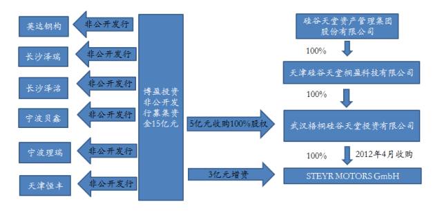 上市公司博盈投资向东营市英达钢结构有限公司(简称“英达钢构”)以及长沙泽瑞创业投资合伙企业(有限合伙)等5家创投机构发行3.14亿股,募集资金15亿元。其中5亿元用于购买武汉梧桐硅谷天堂投资有限公司(简称“武汉梧桐”)100%股权,3亿元向武汉梧桐的全资子公司Steyr Motors GmbH(简称“Steyr Motors”)增资,3亿元投向公司技术研发项目,剩余资金用于补充流动资金。收购完成后,武汉梧桐成为博盈投资的全资子公司。本次增发将导致博盈投资的实际控制权发生变更,英达钢构将以15.21%的持股份额成为博盈投资新的实际控制人。博盈投资此次募资超出了自身的资产规模(7.5亿元)和当时的市值水平(12.53亿元)。硅谷天堂首先由其孙公司武汉梧桐斥资2.84亿元收购Steyr Motor的100%股权,再将武汉梧桐整体以5亿元出售给博盈投资,溢价76%。同时其子公司天津恒丰以2亿元参与博盈投资增发认购,因而获得了重组后的博盈投资7.61%的股权。非公开发行股份募集资金,且已经提前锁定认购方,其审批环节及流程将大为缩减,方案推行的难度要小得多。而由武汉梧桐先行收购Steyr Motors的100%股权,扫除了海外收购的政策性障碍,博盈投资不再需要取得境内、境外政府部门的其他同意、许可或核准。同时,博盈投资本次非公开发行不适用《上市公司重大资产重组管理办法》,也不属于向同一特定对象发行股份购买资产的情形。长沙泽瑞创业投资合伙企业(有限合伙)等5家创投机构入股博盈投资,成为上市公司的财务投资者,但不参与公司管理,预期未来退出时获得十多倍甚至几十倍的投资收益。在这次交易中,英达钢构一跃成为了上市公司的控股股东,硅谷天堂也凭借着其过人的资本运作水平大赚一笔。本案例的交易设计上,前端跨境并购海外资产、中间定向发行及控制权变更和最后购买、处置标的资产之流程可谓一气呵成。具体如下图所示: