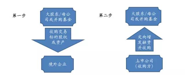 该方案可采用两步走的方式,即:第一步,由上市公司大股东/母公司或并购基金收购境外资产;第二步,再由上市公司通过发行股份购买该资产或定增融资并收购的方式将境外资产注入上市公司。具体交易结构如下: