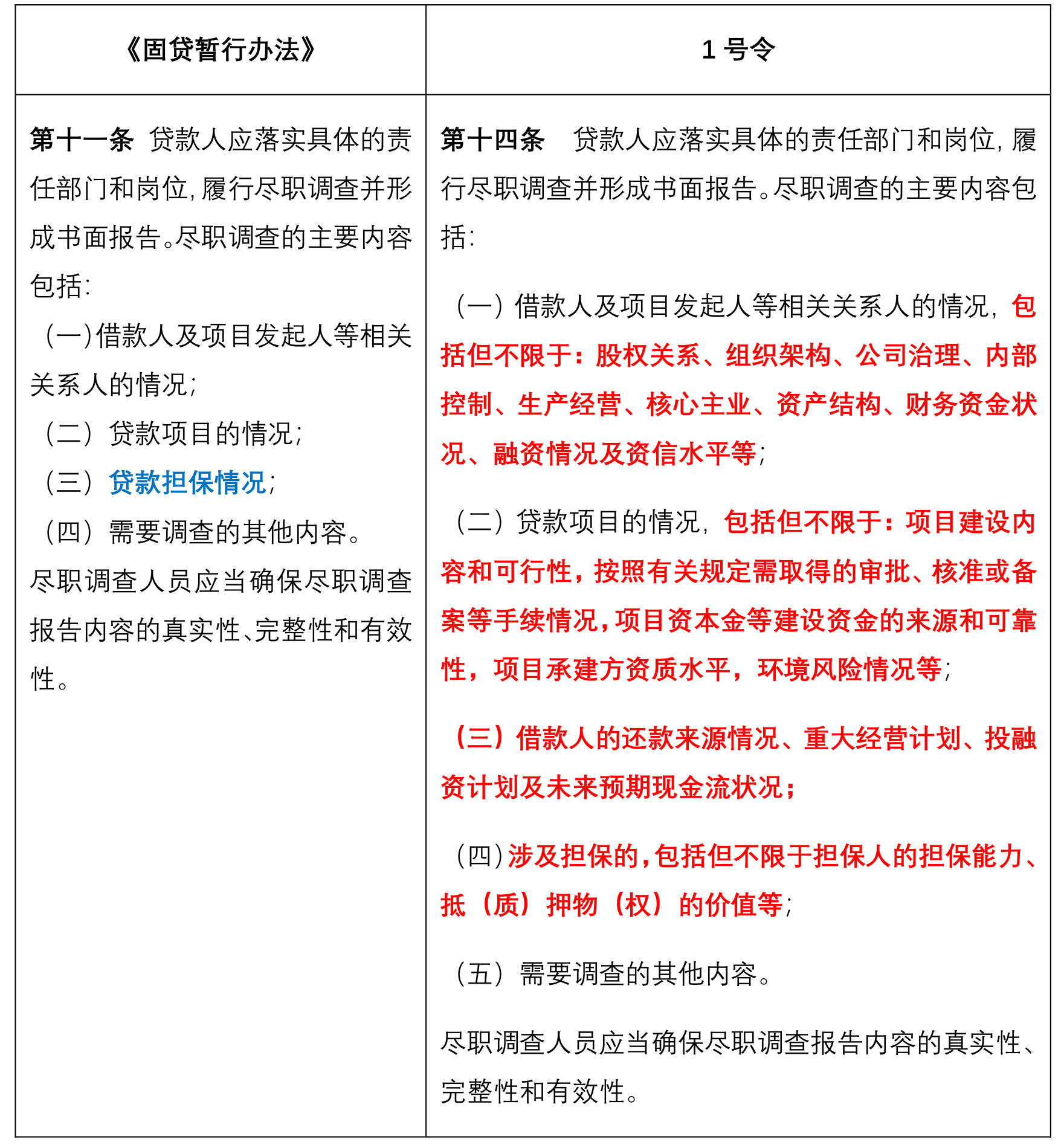 在《固贷暂行办法》的基础上,1号令细化了贷款人尽职调查内容,并增加了“借款人的还款来源情况、重大经营计划、投融资计划及未来预期现金流状况”等内容,具体条款对比请见下表: