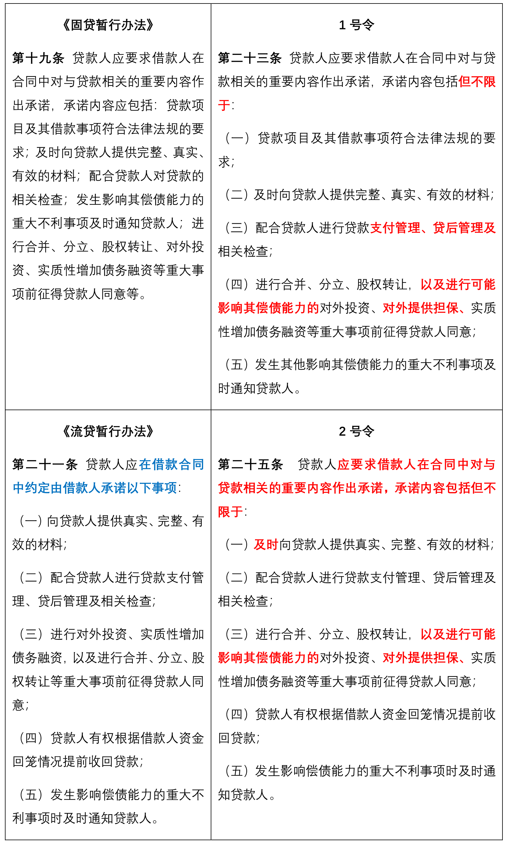 1号令和2号令均对借款人承诺的内容进行了补充,具体请见下表: