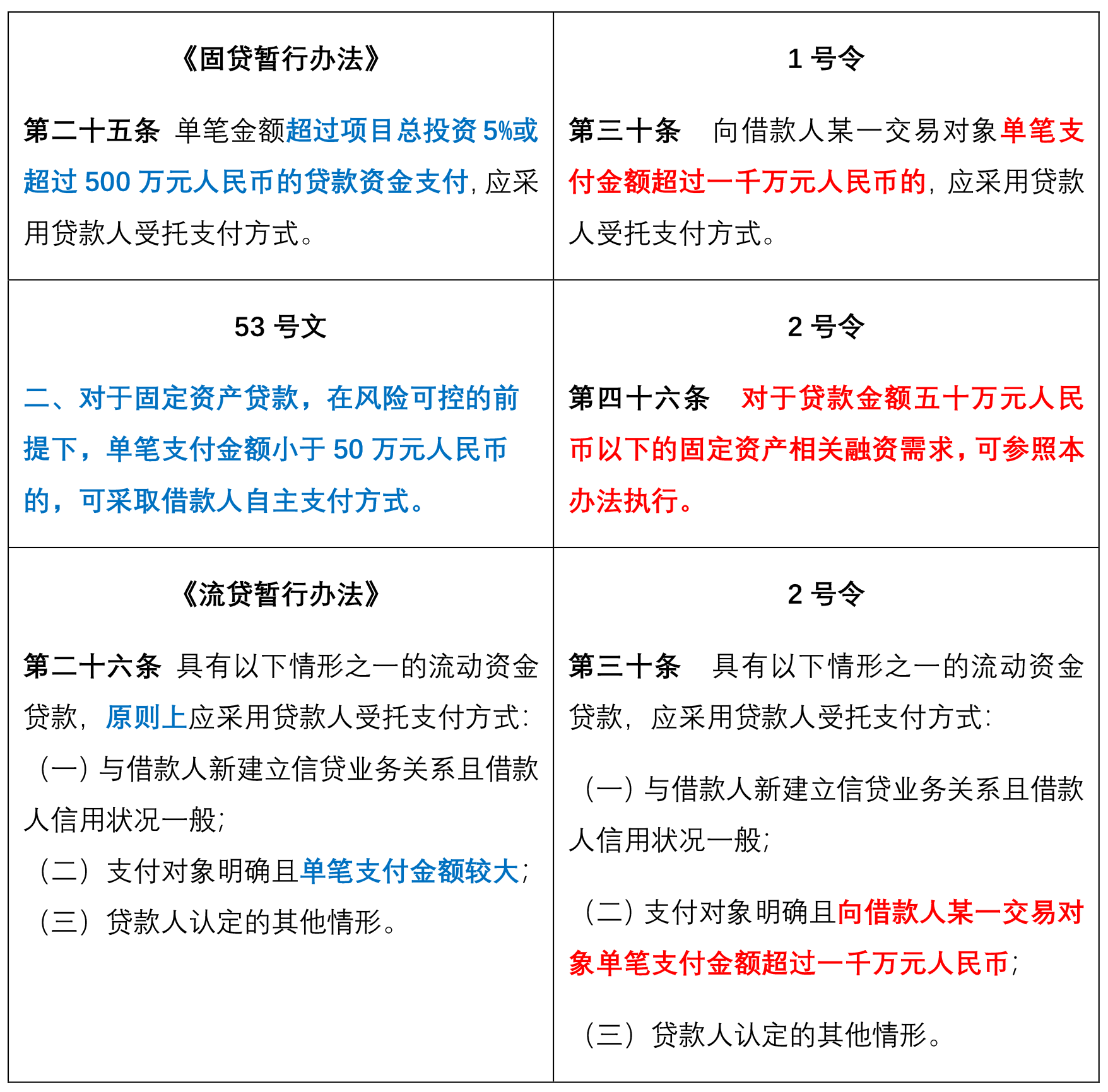 1号令和2号令分别修改了固定资产贷款和流动资金贷款受托支付金额标准,具体修订请见下表: