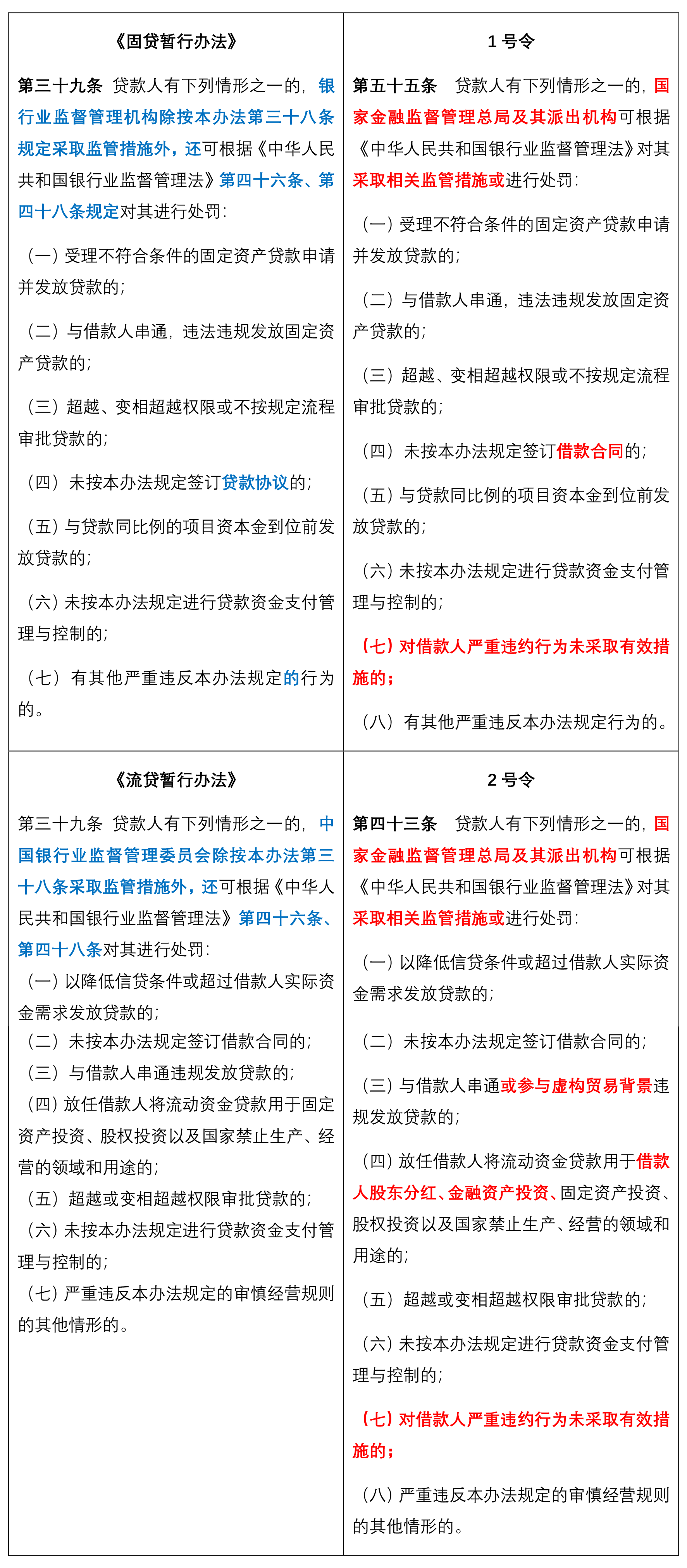 1号令和2号令均修订了贷款人的法律责任相关条款,具体请见下表: