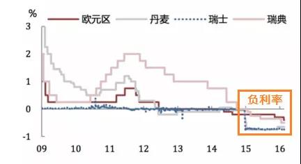 欧洲央行及日本央行将商业银行在央行中的存款利率下调到负数,试图通过零利率刺激银行放贷,倒逼资金进入实体经济。丹麦及瑞士央行的零利率政策是跟进之举,目的是维持汇率稳定。