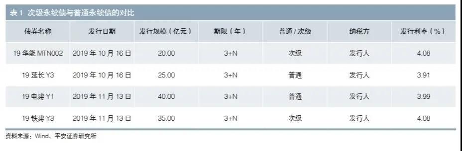 次级属性仅在发行人破产清偿时发挥作用。对于高等级永续债来说,由于发行人破产清算的概率极低,可以近似地将其作为普通永续债看待,获取次级属性的价值。但是评级为AAA级的次级永续债与普通永续债之间的利差正在被市场消化。如表1所示,2019年10月16日发行的两期评级为AAA级的次级永续债和普通永续债发行利率相差17BP,而在2019年11月13日发行的两期评级为AAA级的次级永续债与普通永续债的发行利率仅相差9BP。