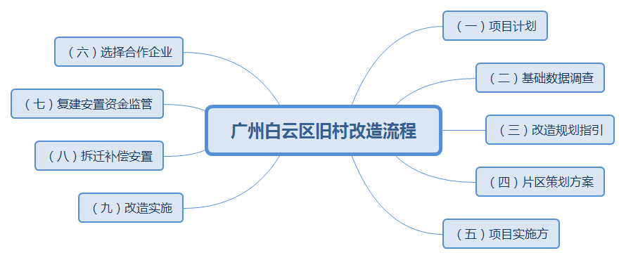 2020年8月,广州白云区推出“关于加快推进旧村庄全面改造工作的补充意见(征求意见稿)”进一步强调了政府主导,理顺了白云区旧村庄全面改造流程,细化了各部门的工作分工。
