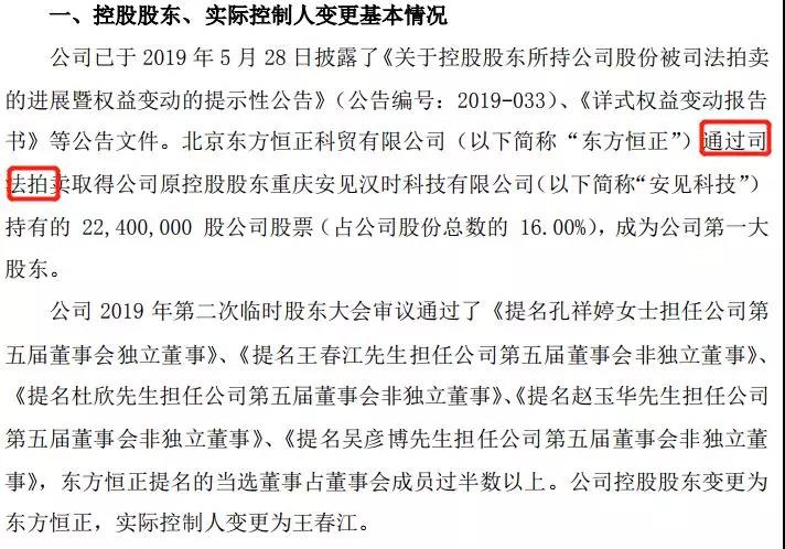 这是司法拍卖的。东方恒正先是通过司法拍卖的方式拿了16%的股权,然后改组并控制了董事会,对上市公司实施了控制。