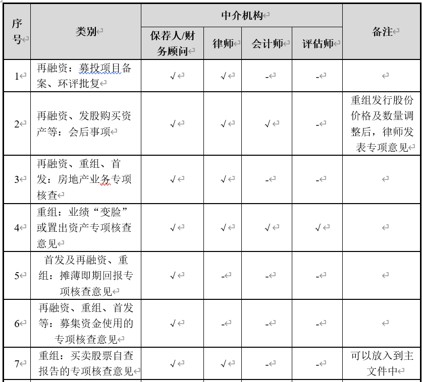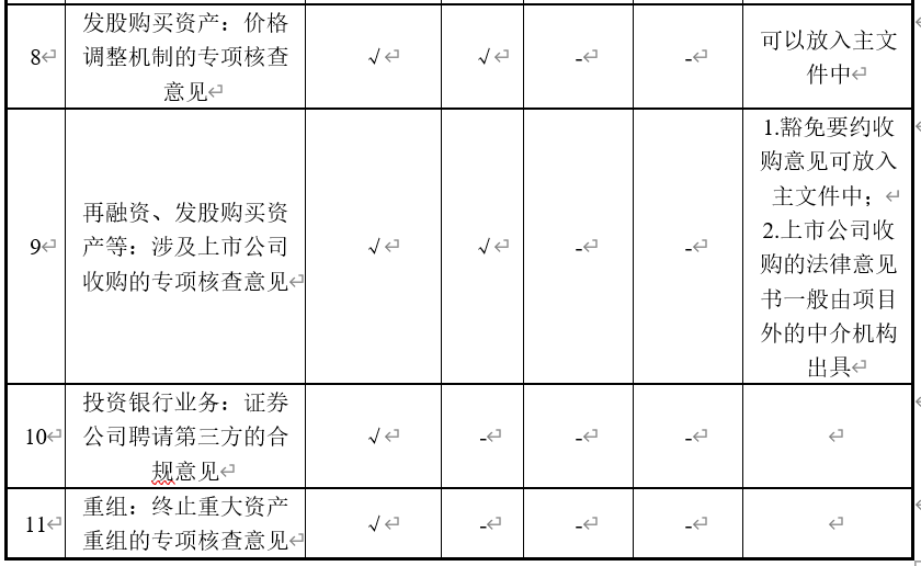 上市公司再融资、重组项目中,除了通常出具的重组报告书、预案、法律意见书等主文件外,一般也需要就一些特别事项出具专项核查意见。本文基于相关规定或问答等,对出具专项核查意见的常见情形进行简要总结,供大家参考。上市公司再融资项目中,按照保代培训提出的要求,需要取得募投项目的核准或备案文件,对于不需要核准或备案的,需要保荐机构及律师出具专项核查意见;同时,募投项目原则上应当取得环评批复才能提交申请文件,不需要环评批复的,保荐机构和律师应当出具专项核查意见。因此,再融资募投项目若不需要募投项目核准/备案或者不需要环保部门出具批复文件的,保荐机构及律师通常也会出具专项核查意见,以确认不需要核准、备案或环保批复。1.根据《股票发行审核标准备忘录第5号(新修订)——关于已通过发审会拟发行证券的公司会后事项监管及封卷工作的操作规程》(以下简称《备忘录第 5 号》),公司发行前,审核员应督促发行人提供会后重大事项说明,要求主承销商及发行人律师、会计师对公司在通过发审会审核后是否发生重大事项分别出具专业意见。是否需要重新提交发审会审核的标准发行人如果满足以下全部条件,不再提交发审会审核。包括:1、注册会计师出具了无保留意见的审计报告。2、主承销商出具的专项说明和发行人律师出具的法律意见书中没有影响公司发行新股的情形出现。3、公司无重大违法违规行为。4、公司的财务状况正常,报表项目无异常变化。5、公司没有发生重大资产置换、股权、债务重组等公司架构变化的情形。6、公司的主营业务没有发生变更。7、公司的管理层及核心技术人员稳定,没有出现对公司的经营管理有重大影响的人员变化。8、公司没有发生未履行法定程序的关联交易,且没有发生未在申报的招股说明书中披露的重大关联交易。9、经办公司业务的主承销商、会计师和律师未受到有关部门的处罚,或未发生更换。10、公司的盈利状况与盈利预测(如有)趋势基本相符。11、公司及其董事长、总经理、主要股东没有发生重大的诉讼、仲裁和股权纠纷,也不存在影响公司发行新股的潜在纠纷。12、没有发生大股东占用公司资金和侵害小股东利益的情形。13、没有发生影响公司持续发展的法律、政策、市场等方面的重大变化。14、公司的业务、资产、人员、机构、财务的独立性没有发生变化。15、公司主要财产、股权没有出现限制性障碍。16、上市公司不存在违反信息披露要求的事项。17、公司不存在其他影响发行上市和投资者判断的重大事项。2.根据证监会《再融资业务若干问题解答》,发行人在通过发审会后启动发行前,年报或半年报公布后,发行人及中介机构应及时报送会后事项文件。会后事项文件包括发行人及各中介机构按照《备 忘录第 5 号》的规定出具的会后重大事项说明或专项意见,以及更新后的募集说明书(如有)、发行保荐书、新公布的年报或半年报。对涉及历史盈利条件的再融资品种,发行人在跨年后、未出具年报前启动发行,发行人及中介机构应及时报送会后事项文件。发行人需以业绩预告或快报为基础对跨年后是否仍满足发行条件进行说明,保荐机构对发行人跨年后是否仍满足发行条件发表意见,发行人及各中介机构按照《备忘录第 5 号》的规定出具会后重大事项说明或专项意见。发审会后发生大股东所持发行人股份被冻结、控制权变更或可能变更、重大诉讼、重大违法违规、募投项目出现重大不利变化、实施利润分配方案需要调整发行方案、更换中介机构或签字人员等《备忘录第 5 号》规定的 17 项可能影响本次发行的其他重大事项时,发行人及各中介机构也应报送会后事项文件进行说明。根据《深圳证券交易所上市公司信息披露指引第3号——重大资产重组》等规定,上市公司重大资产重组如涉及新增股份上市,需在披露重组标的资产(含负债)过户结果公告及相关中介机构核查意见后向证券登记结算机构申请办理新增股份登记工作,并在证券登记结算机构出具《股份登记申请受理确认书》后的次一个交易日到本所办理股份上市手续。上市公司重大资产重组申请取得中国证监会核准文件后,若因实施利润分配或者资本公积转赠股本方案需要调整股份发行价格及发行数量的,上市公司应当在办理新增股份登记托管及上市手续前,根据重组方案规定的调整办法对发行价格及发行数量进行调整,并对外披露调整公告,同时聘请律师出具专项法律意见书。根据《证监会调整上市公司再融资、并购重组涉及房地产业务监管政策》,上市公司再融资、并购重组涉及房地产业务的,国土资源部不再进行事前审查,对于是否存在土地闲置等问题认定,以国土资源部门公布的行政处罚信息为准;对于是否存在正在被(立案)调查的事项,中介机构应当充分核查披露。……保荐机构或独立财务顾问、律师应当出具专项核查意见。在专项核查意见中明确说明是否已查询国土资源部门网站,相关房地产企业是否存在违法违规行为,是否存在被行政处罚或正在被(立案)调查的情况。另外,上市公司公告涉房类再融资、并购重组项目后,证监会、交易所、证监局通过媒体报道、举报等途径知悉房地产企业涉嫌存在未披露的土地闲置等违法违规行为的,可以视情况采取以下措施:要求上市公