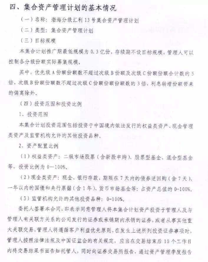 陈业出示的渤海分级汇利13号管理合同显示,该产品优先级A份额的年约定利率为6.8%,优先级A份额根据合同约定获取收益,是风险较低、收益较为稳定的集合计划份额;次级B份额的预期年化收益率为9.5%,在此基础上,根据集体计划实际收益情况享有浮动收益,在集体计划终止清算时,本集合计划资产净值扣除优先级A份额、次级B份额本金及预期收益、次级C份额本金后仍有剩余收益的,次级B享受该剩余收益的20%。