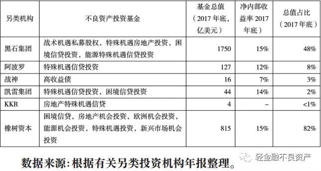 黑石集团、橡树资本的不良资产投资主要集中在特定基金之中,并对不同类别的不良资产加以区分;而阿波罗、战神、凯雷集团、KKR则很少有单纯投资不良资产的基金,往往将不良资产投资融合在区域投资基金之中,或在某些投资领域(基础建设投资、房地产、能源、医疗等)与正常资产进行策略组合。