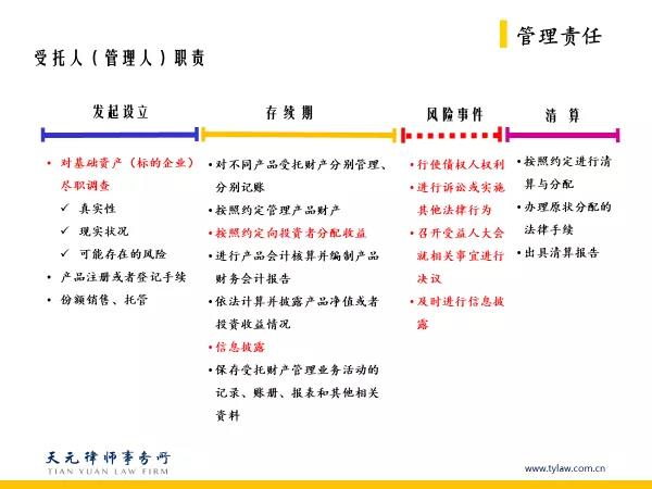 (2)“受托人义务”:委托投资模式中,管理人按照委托投资管理协议和委托投资指引内容对标的资产进行管理,绝大部分话语权在委托人身上,发生风险时由委托人承担,受托人只在违反了投资管理协议的情况下承担违约责任。资产管理产品业务中,则是完全围绕管理人的“主动管理能力”展开的。同时,管理人行为受制于法定义务+合同约定义务,因此,发生风险时由受托人承担责任。管理人法定义务根据不同业务阶段有所不同,例如产品发起设立时负有尽职调查义务,风险事件发生时负有信息披露义务,具体的参考认定标准如图,同时也可以结合相关资管案例的裁判文书内容来对管理人的义务内容进行界定。