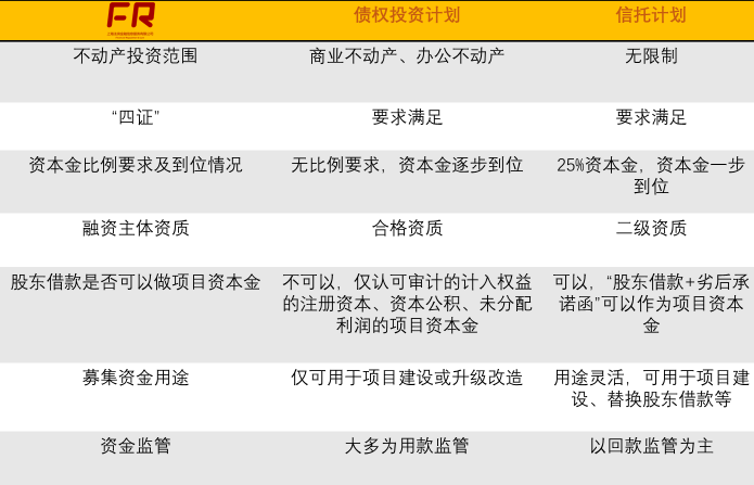 VS信托投资不动产:这里将保险资金债权投资计划和房地产信托计划的投资条件进行比较,如图所示: