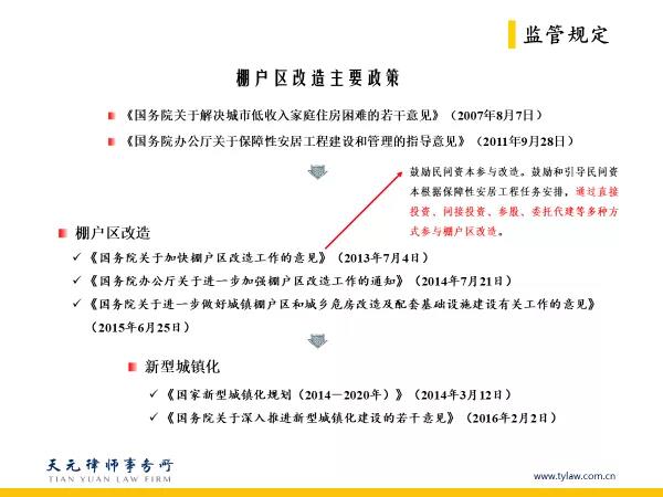 保障房与棚改:由于保障房和棚改不属于商业住宅,因此,可以用保险资金进行投资。其中,棚改项目的核心是怎么论证模式的合规性,相关合规要求如图: