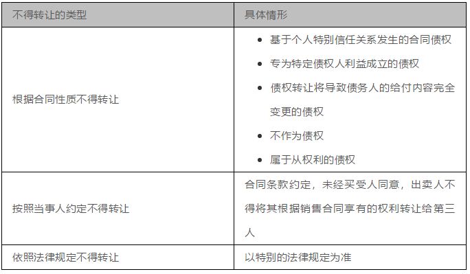 (1)根据《合同法》第79条,债权人可以将合同的权利全部或者部分转让给第三人,但以下三种情况除外:根据《企业应收账款资产支持证券挂牌条件确认指南》第4条规定,基础资产应当具有可转让性。基础资产的转让应当合法、有效,转让对价应当公允,存在附属担保权益的,应当一并转让。如存在上述三种情形,则不满足“基础资产应当具有可转让性”的规定。