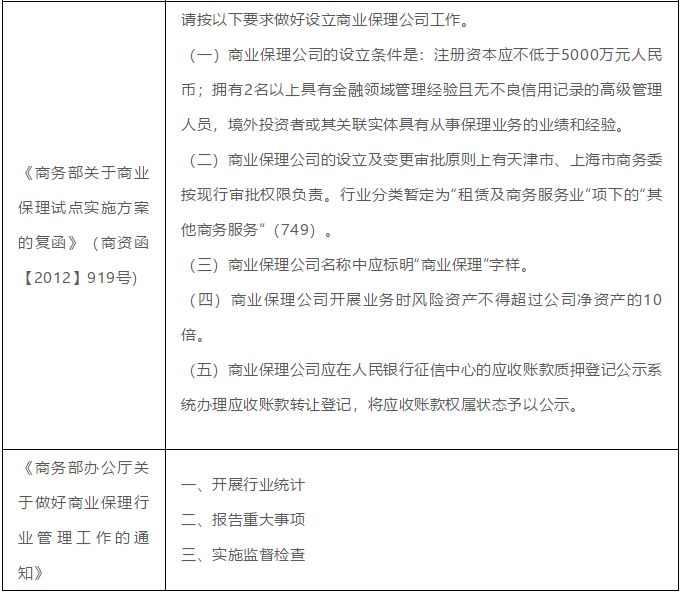 (1)根据《商务部关于商业保理试点有关工作的通知》和《商务部关于商业保理试点实施方案的复函》,商业保理公司的设立及批复原则上需满足以上五个条件,不同试点地区商业保理公司设立的具体条件及申请材料应当符合当地商业保理行业管理的规定,在具体的保理融资债权资产证券化操作中应根据保理商所在省市的不同考察相应的适用规则,以核查保理商是否已经取得相应的经营资质。