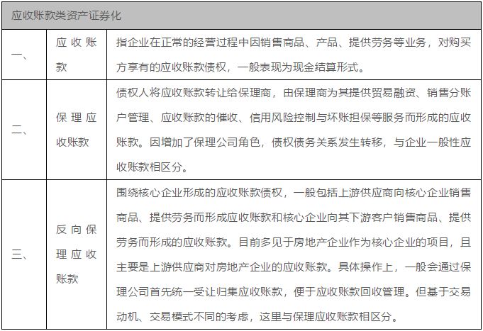 根据目前交易所市场上应收账款资产证券化项目类型,基础资产为应收账款类的资产证券化业务分类如下表所示: